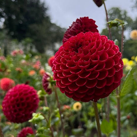 En murrigt röd vacker perfekt rund boll, den blir ca 10cm i blomman och plantan ca 110cm hög. Den röda färgen är svår att beskriva men det finns ett dovt skimmer. Jag älskar den här sorten! Den är makalöst bra till snitt och blommar mycket rikligt! Den vackraste röda dahlian jag vet