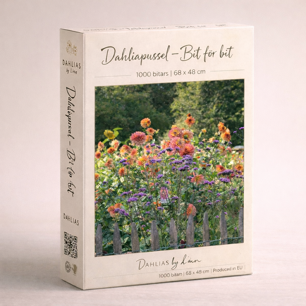 Vi är så glada att äntligen få presentera vårt alldeles egna dahliapussel – ett blomstrande motiv från vår underbara visningsträdgård.